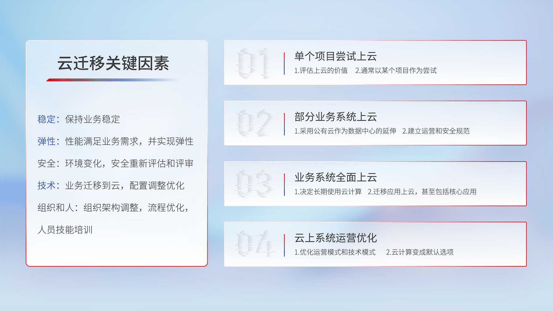 结合实际业务,,从规划设计、、、、云平台选型、、云原生改造、、数据迁移、、集成交付,,迁移全过程为客户识别最佳上云路径,,,,做好风险识别管理,,,设计网络架构、、身份权限、、、、安全审计合规、、操作审计、、、、日志审计、、、、监控告警策略、、、多站点容灾设计等,,对云上基础设施进行整体规划,,提升IT治理水平,,,,以满足弹性、、、高可用、、、、高性能的需求。。