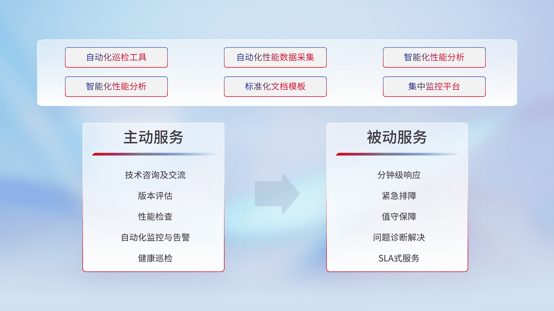 智能化工具和标准化文档,,,保障服务质量,,提供主动服务(包含技术咨询、、版本评估、、、性能检查、、、自动化监控与告警、、、健康巡检)和被动服务包含(分钟级响应、、紧急排障、、、、值守保障、、、、问题诊断解决、、、、SLA服务)。。。。