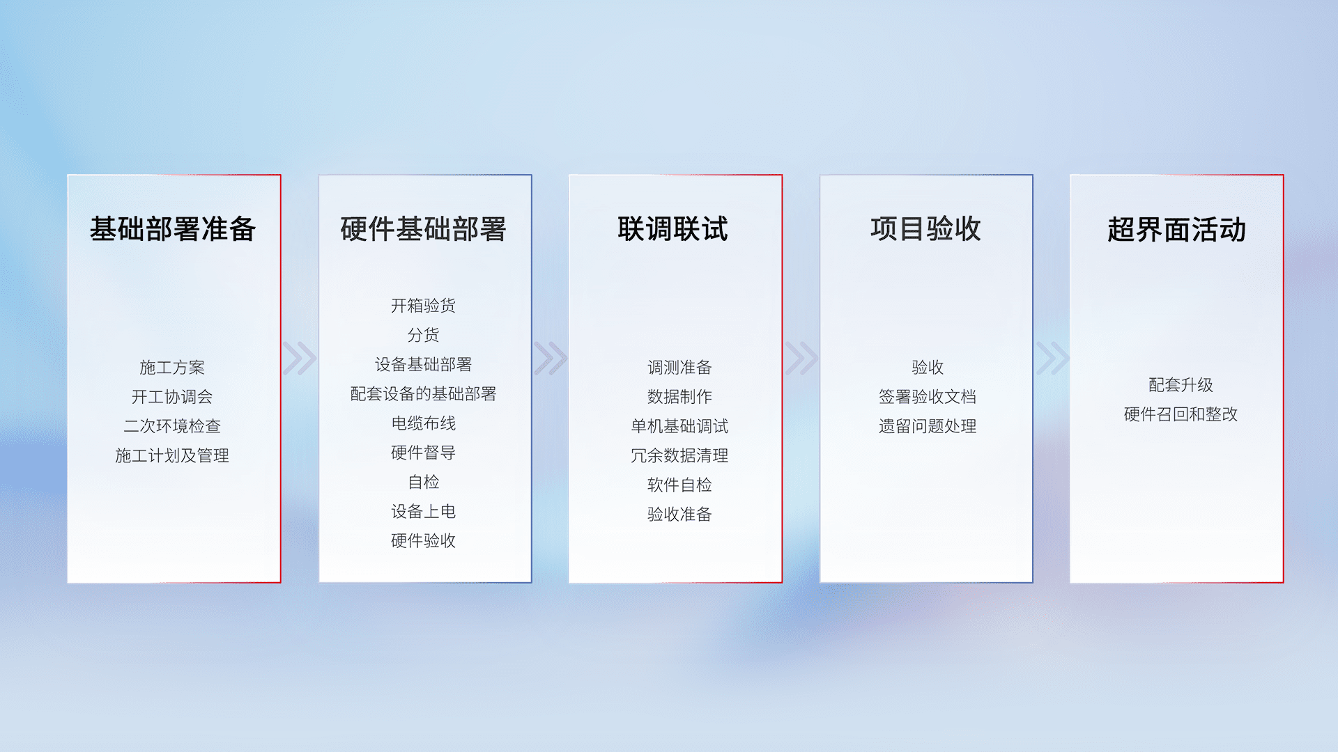 从基础部署准备、、、硬件基础部署、、、、联调联试、、、、项目验收、、越界面活动的全过程可追溯,,,保证施工质量和进度。。。。